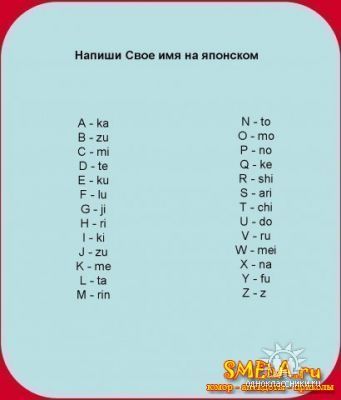 | Так, чисто ради прикола составляем японские ники:) А - ka B - zu C - mi D - te E - ku F - lu G - ji H - ri I - ki J - zu K - me L - ta M - rin N - to O - mo P - no Q - ke R - shi S - ari T - chi U - do V - ru W - mei X - na Y - fu Z - z